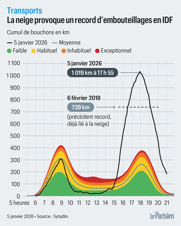 📍 En Île-de-France, les conséquences d’un tel scénario ont déjà été observées en début de semaine : lundi 5 janvier, plus de 1 000 kilomètres de bouchons cumulés ont été enregistrés en fin de journée selon Sytadin, un record absolu pour la région, bien au-delà du précédent pic de 739 km en février 2018. Cette situation exceptionnelle s’était produite alors que les chutes de neige se maintenaient en milieu d’après-midi, rendant la conduite particulièrement difficile.